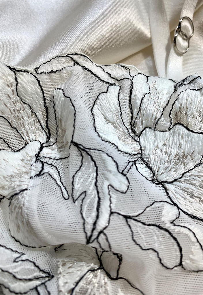 • Deconstructed floral embroidery inserts on stretch mesh cup and body